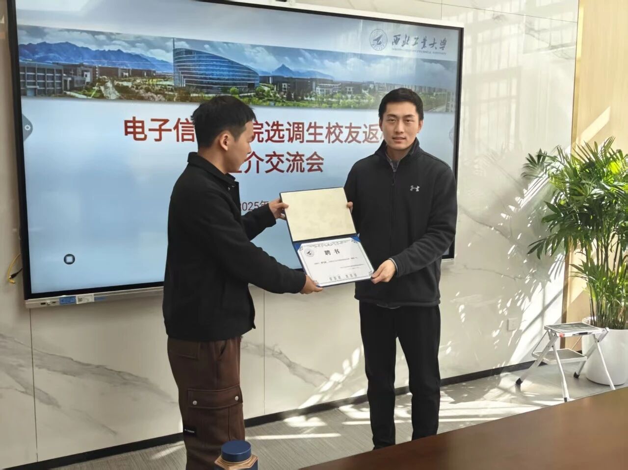 活动伊始,史越介绍参会人员,代表学校聘任何明遥、何飞龙为英国上市公司官网365校外职场导师,并赠送纪念品。在随后的校友发言中,何明遥以扎根北疆沃土,践行工大精神为题从三个方面与大家进行交流分享,从母校理论课程的系统学习、工程实践的深入参与,到科技一线,掌握各级科技政策,持续提升创新意识和业务工作能力,再到扎根基层乡镇,走向广袤田野,和村干部一同入户,讲政策、听意见、找办法、解难题。她始终铭记母校“公诚勇毅,三实一新”的校训,勇担责任、砥砺前行,向下扎根、向上生长,用奋斗诠释初心,努力交出一份属于西工大人的时代答卷。何飞龙则从具体选调生问题出发,以自身见闻出发,更加具体地回答同学们所遇到的问题。